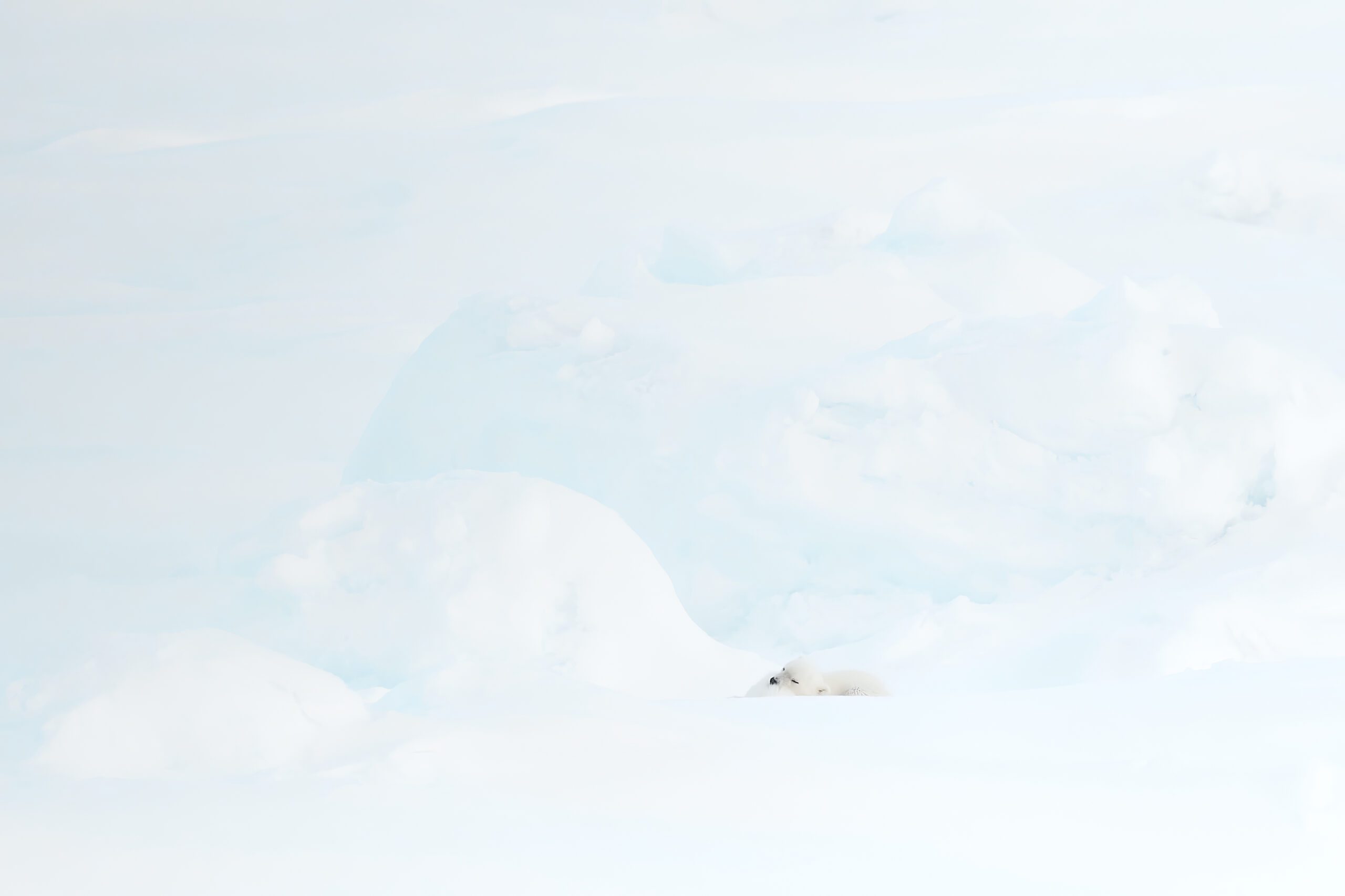 Dans une position de vigilance, la mère garde ses petits près d’elle, son regard dur et déterminé. Le danger est toujours latent dans ce monde froid, et chaque mouvement de l’ours est dicté par l’instinct de protection. Ses yeux ne quittent pas l’horizon, prête à défendre ses petits contre tout ce qui pourrait les menacer.
